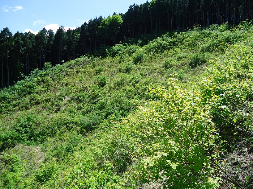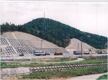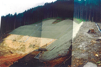 現地で発生した表土をバーク堆肥と混合して吹きつけたのち、侵食防止と表土の流出防止を目的としてSP‐45を設置した。 施工後12年後には植生の被覆率がほぼ100%となり、周辺植生と同じ植生群落を形成している。 |