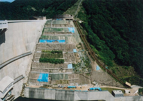 温井ダム堤体法枠の侵食防止及び緑化を目的に多機能フィルターと苗バッグ(クマザサ)を施工。岩盤部は法枠の中に客土を吹付け、侵食防止のため多機能フィルターが敷設された。 当現場は55~60°の急勾配で、かつ南西方向に面しており夏場は高温で集中豪雨の多い悪条件下であるが、順調に樹林化が進行している。 |